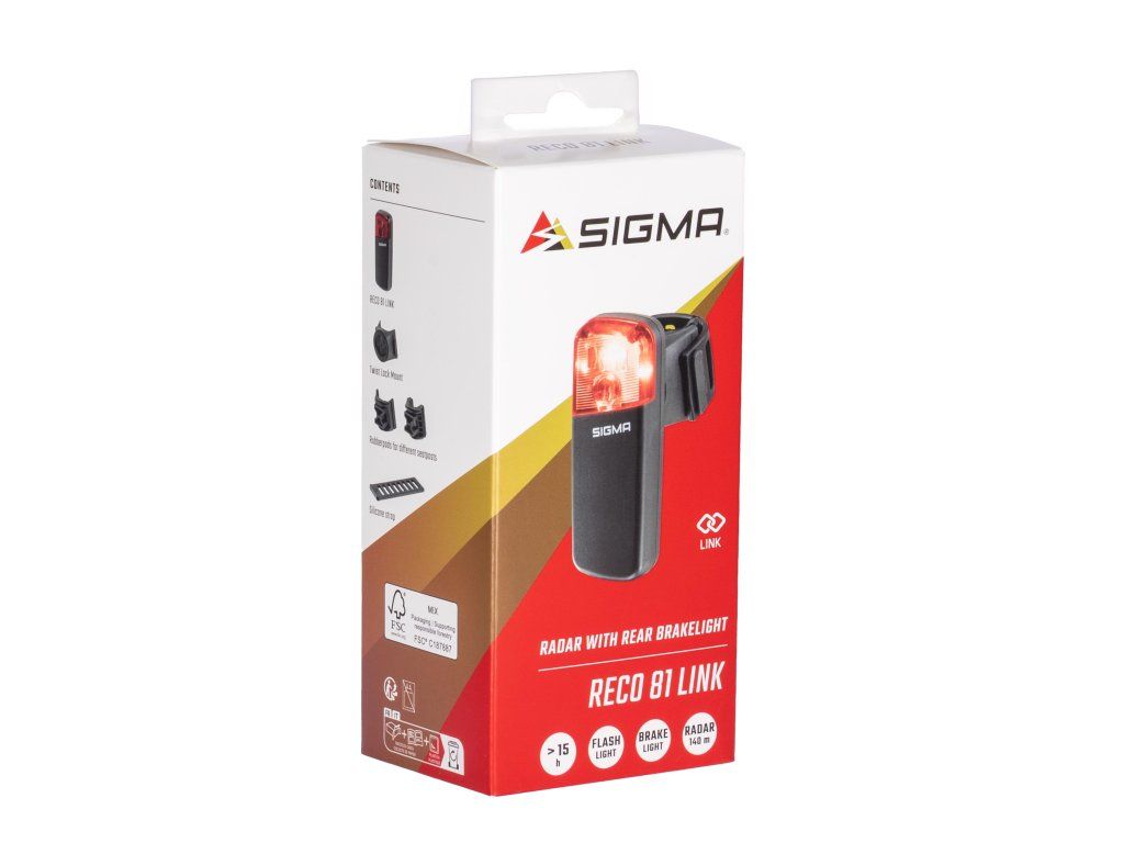 SIGMA RECO 81 LINK je chytré zadní světlo s integrovaným radarem, které detekuje vozidla přijíždějící zezadu a zároveň zajišťuje vysokou viditelnost cyklisty ve dne i v noci. Brzdové světlo a nouzové brzdové světlo reagují během zlomku sekundy a zvyšují bezpečnost v provozu.