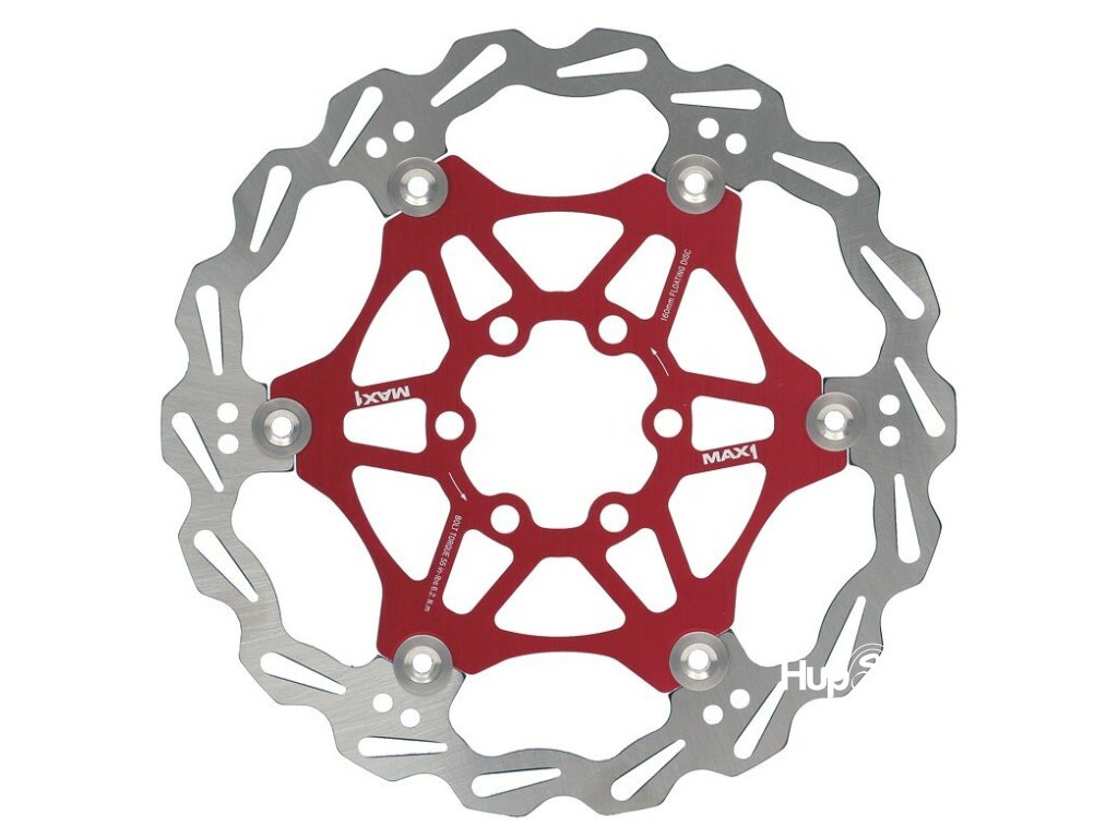 Lehký a výkonný brzdový kotouč MAX1 Alux s červeným hliníkovým unašečem, průměr 160 mm. Skvělé chlazení, vysoká účinnost a odolnost.