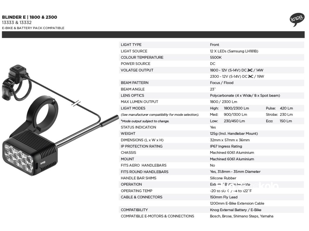Nové světelné hlavice Blinder E od značky KNOG jsou napájené z baterie elektrokola. Obsahují kabeláž, kterou je potřeba spojit se správným konektorem daného výrobce elektrokol.
