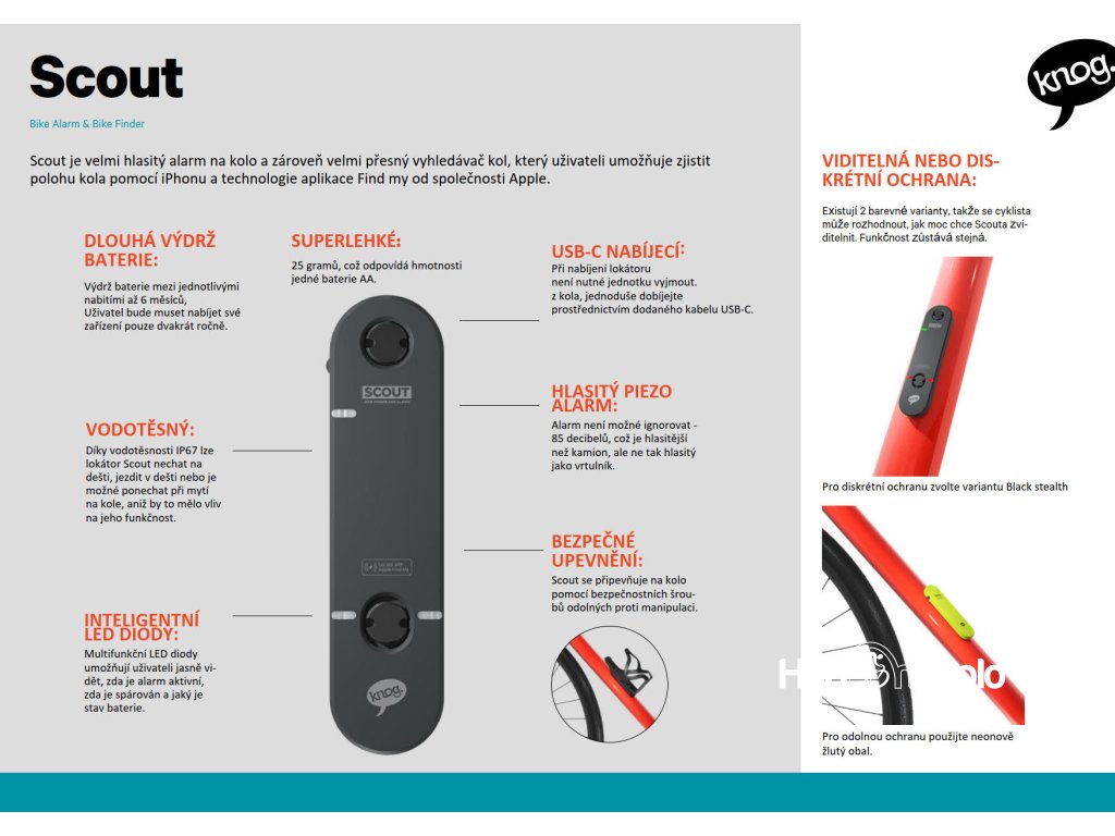 KNOG Scout je lehký a nízkoprofilový lokátor a alarm pro jízdní kola navržený tak, aby se bez problémů integroval do sítě produktů FindMy od Apple, a umožňuje sledovat, kde se kolo nachází, i když není zrovna v pohybu. Připevnění je diskrétní a bezpečné pod jakýkoli košík na láhev pomocí dodávaných bezpečnostních šroubů. Zařízení se dobíjí přes USB-C a při běžném používání vydrží v provozu přibližně 6 měsíců. Cyklisté mohou aktivovat/deaktivovat alarm citlivý na pohyb, lokalizovat zařízení a kontrolovat výdrž baterie prostřednictvím aplikace Knog.