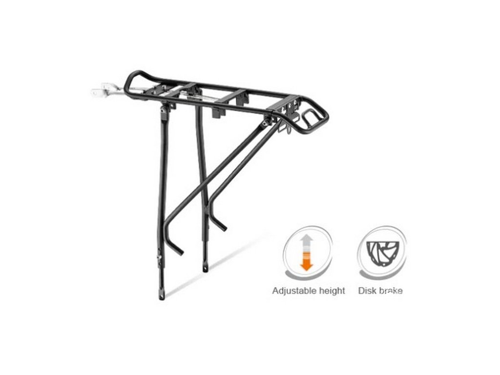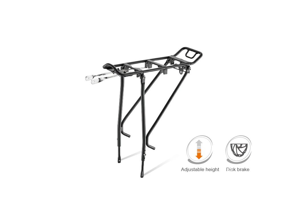 Zadní nosič Ibera RA21 nabízí ideální kombinaci nízké hmotnosti, pevnosti a univerzální kompatibility. Díky propracované konstrukci pasuje na většinu kol velikosti 26" až 29" a hodí se jak pro klasické ráfkové brzdy, tak i pro moderní kotoučové brzdy – tvarované vzpěry obcházejí brzdový třmen a umožňují stabilní uchycení bez nutnosti adaptérů.
