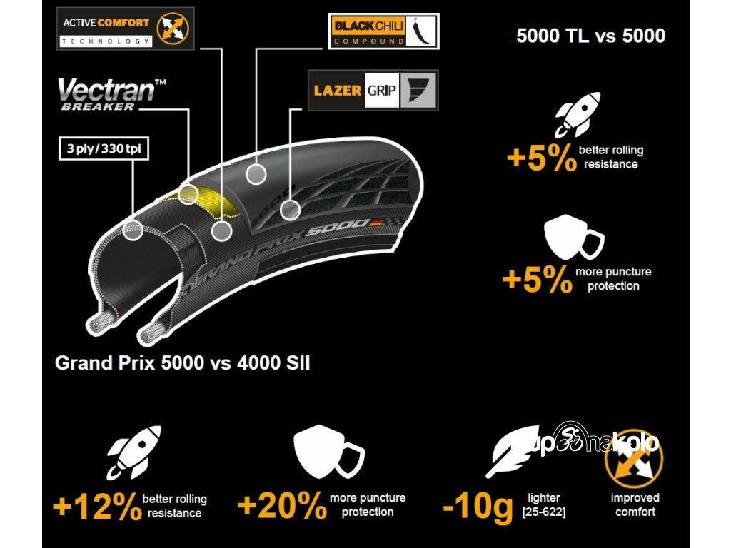 Continental Grand Prix 5000 je silniční plášť pro závodní použití, který nahrazuje legendární a v profi pelotonu nejpoužívanější Grand Prix 4000 II. Díky mnoha letům vývoje se podařilo snížit hmotnost a valivý odpor pláště a naopak zvýšit odolnost proti defektům.