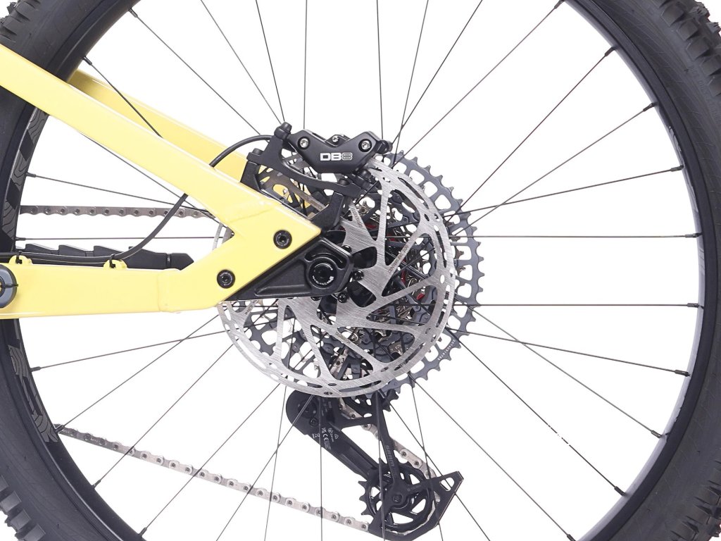 Pohon obstarává bezdrátový SRAM GX Eagle Transmission 1×12 s rozsahem 520 %. Řazení funguje přesně i pod plným zatížením a spolu s bezdrátovou teleskopickou sedlovkou SRAM Reverb AXS udržuje kokpit maximálně čistý. O brzdný výkon se starají SRAM DB8 s kotouči 200 mm, které drží konstantní výkon i v dlouhých sjezdech.