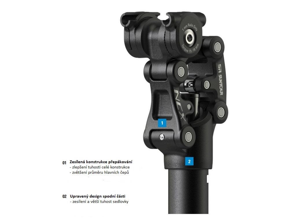 Tato odpružená sedlovka SR Suntour SP25-NCX v nové generaci přináší výrazná zlepšení v oblasti tuhosti a odolnosti díky robustnějšímu pružícímu mechanizmu. Optimalizace zahrnuje zvětšené průměry čepů a zesílená ramínka, což zajišťuje hladší chod i při vyšším zatížení. Tento model je navržen tak, aby maximálně tlumil nárazy a zvýšil pohodlí jezdce na nerovných površích.