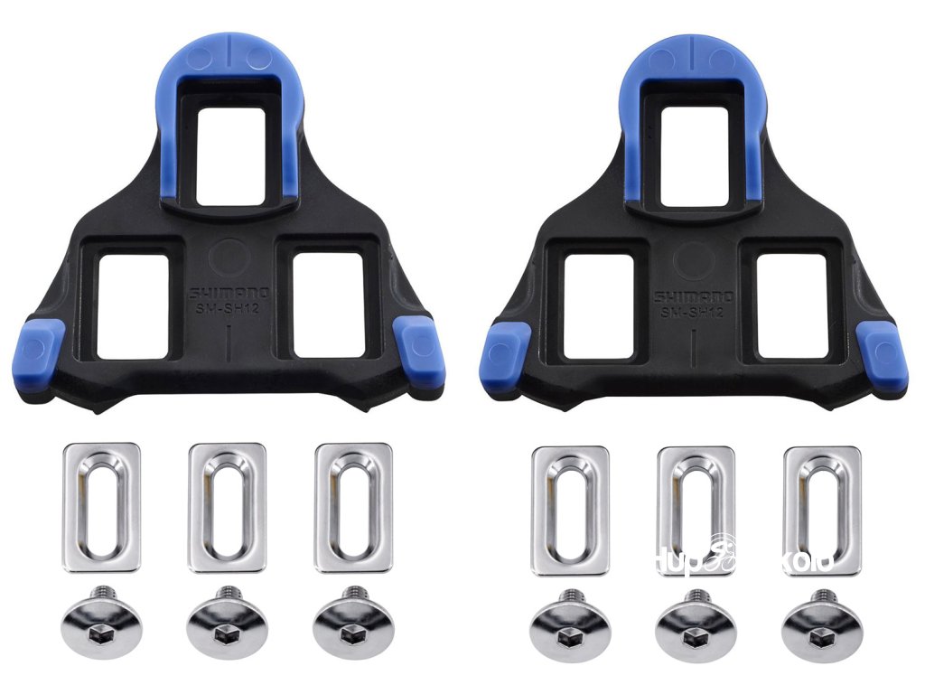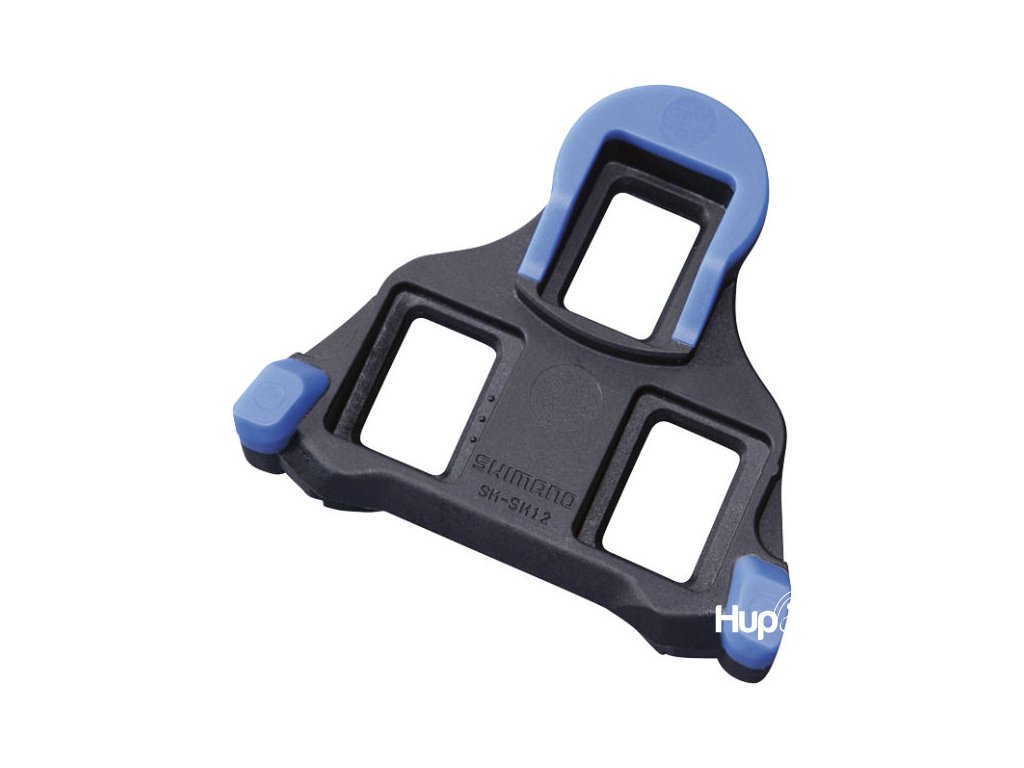 Zarážky pedálu Shimano SM-SH12 SPD-SL v modré barvě se středovým otočným režimem. Umožňuje chodidlům pohybovat se ze strany na stranu pod úhlem 2 stupňů.