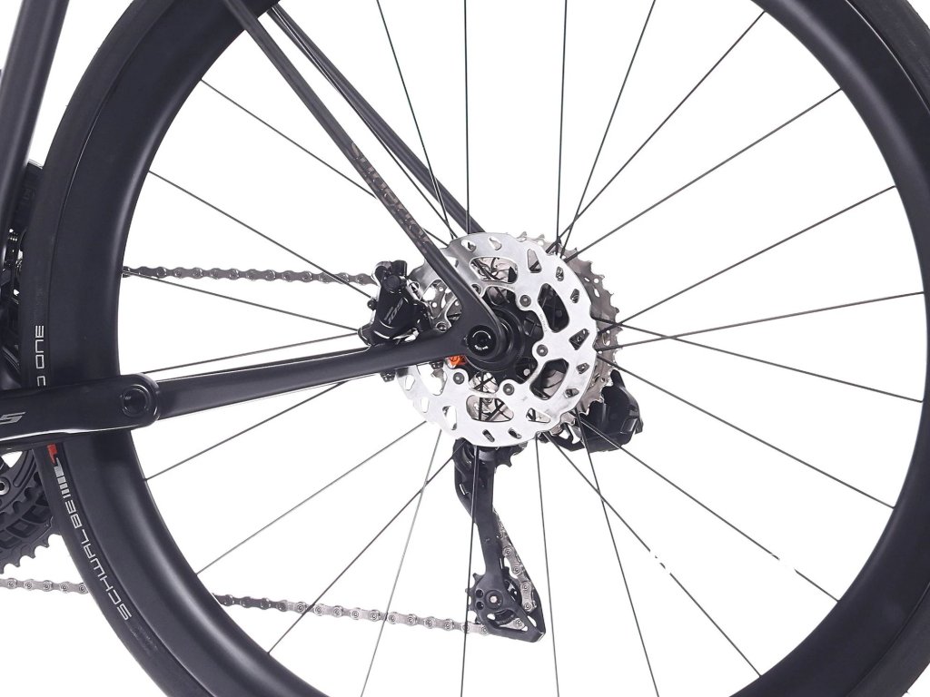 Jedním z hlavních rozdílů oproti nižším modelům jsou karbonová kola DT Swiss ERC 1600 DICUT® 45 mm. Tyto zapletené sety kombinují vysokou aerodynamickou efektivitu, tuhost a komfort, což se přímo promítá do rychlosti a stability kola. Obutí Schwalbe Pro One Evo TL-Easy 28 mm se směsí ADDIX Race a ochranou V-Guard je připraveno na bezdušový provoz a závodní nasazení.