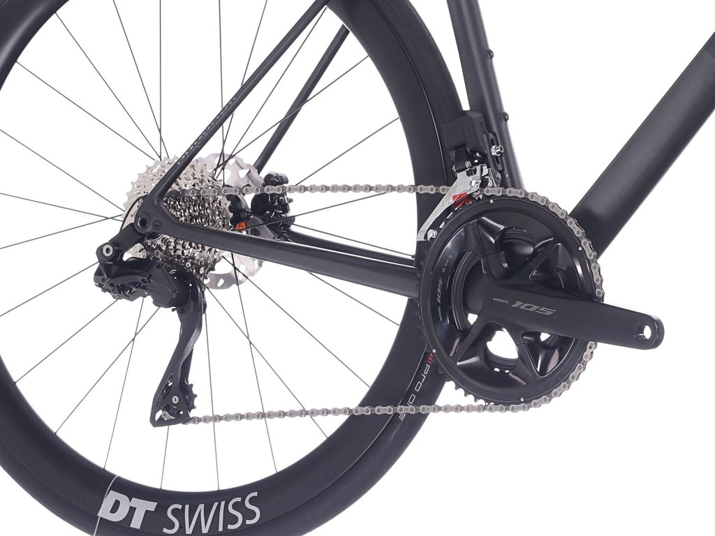 Základem kola je karbonový rám Carbon RR Mid Modulus s Road Advanced geometrií, který nabízí ideální rovnováhu mezi tuhostí a nízkou hmotností. Rám je optimalizován pro kotoučové brzdy Flat Mount, pevné osy 12×142 mm, středové složení BSA 68 mm a plně vnitřní vedení kabeláže. Samozřejmostí je kompletní kompatibilita s elektronickým řazením Di2.