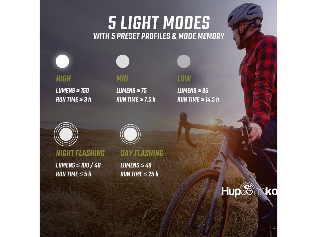 5 světelných režimů: High 150 lm | Mid 75 lm | Low 35 lm | Noční blikání 100/40 lm | Denní blikání do 40 lm
