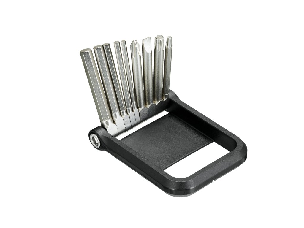 9 funkcí:  Imbus 2 / 2,5 / 3 / 4 / 5Klíč Torx T10/T25Šroubovák PH2 / plochý 45 mm kované obráběné bity